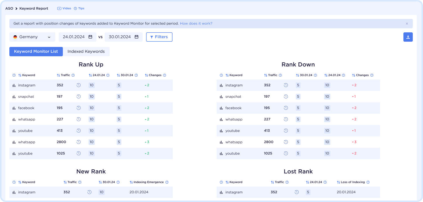 Monitor changes in app ranking on Google Play & App Store